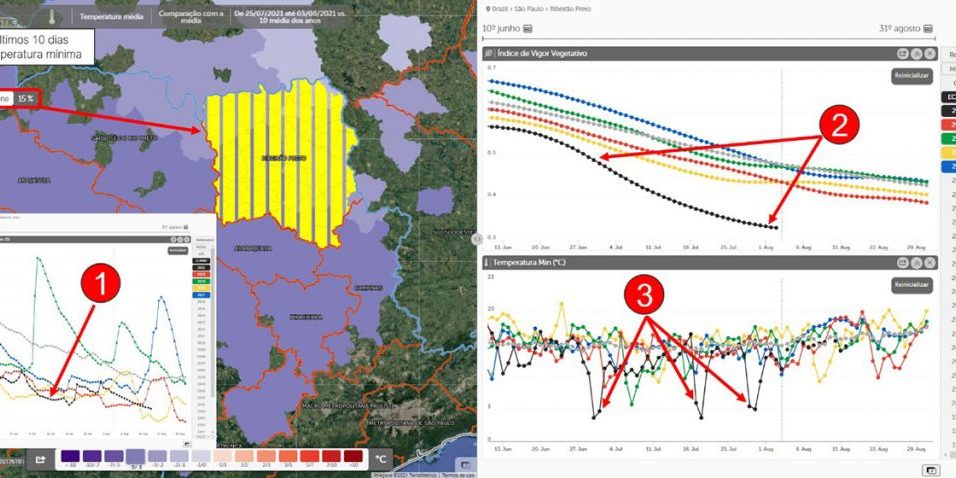 Na região de Ribeirão Preto, área com produção de cana-de-açúcar, a precipitação abaixo da média nos últimos meses manteve a umidade do solo baixa, o que limitou o potencial produtivo. Além disso, o NDVI apresentou uma queda mais acentuada nas últimas semanas, em linha com as três ondas de frio registradas no período. A temperatura mínima média da região ficou abaixo dos 5°C nas três ocasiões (fim de junho, e meio e fim de julho). Vale ressaltar que, em algumas regiões (como em Barretos, por exemplo) houve temperaturas negativas. Ainda há a necessidade de esperar mais alguns dias até que os impactos das geadas sejam contabilizados.