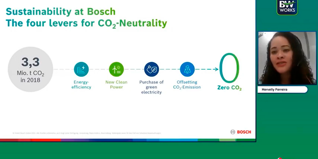 Durante o BW Works Case Bosch: Neutralidade de Carbono, promovido pelo Movimento BW, iniciativa da Associação Brasileira de Tecnologia para Construção e Mineração (Sobratema), no dia 7 de outubro, a chefe corporativa de Sustentabilidade e EH&S da Bosch comentou ainda que a multinacional trabalhará com seus fornecedores, sua logística, as viagens corporativas e os parceiros de negócios, com o propósito de reduzir em 15% as emissões da cadeia de valor. Outro ponto de atuação continuará a ser no desenvolvimento sustentável do produto para torna-lo ainda mais eficiente no uso, com menor consumo de energia e emissões.