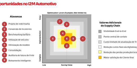 No setor automotivo, de forma geral, identificamos oportunidades de melhoria importantes na malha de transportes, consolidação de volumes, aspectos tarifários, roteamento inteligente e, principalmente, na satisfação dos clientes, o que com certeza está no foco de todos. Nesta metodologia, cruzamos as alavancas e os valores agregados da supply chain, formando uma matriz de atuação como mostra este exemplo a seguir.