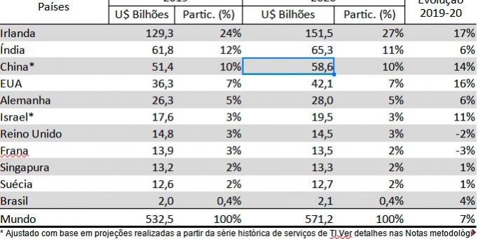 Assim, a Irlanda segue como principal exportador de Serviços em TI, com 27% do total mundial, seguida pela Índia, com 11%, e China, com 10%, só depois vem os Estados Unidos, com 7%.